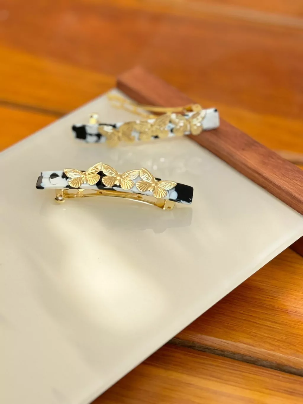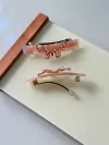 Presilha de acetato com detalhe de borboleta em metal, vendida por preço individual, corresponde a somente 1 unidade. Este modelo delicado traz um toque de charme e sofisticação ao seu visual.